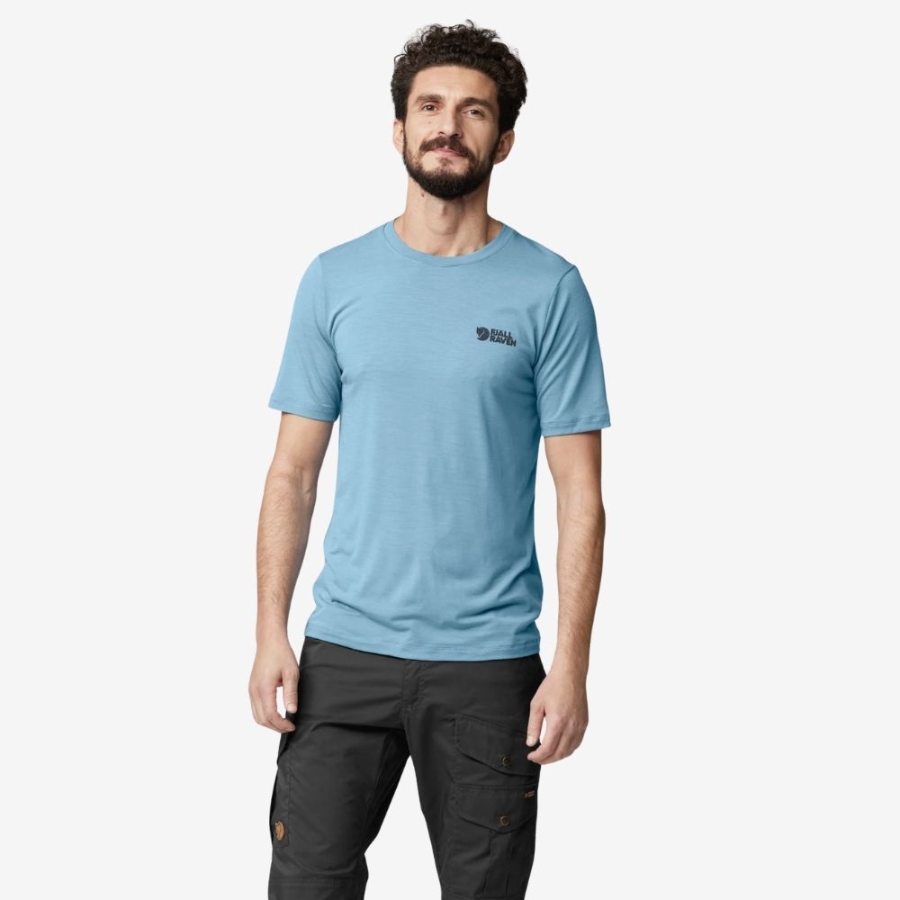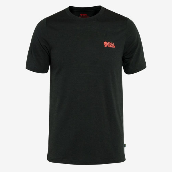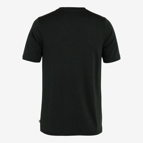 Fjällräven Men's Abisko Wool T-Shirt blends merino’s temperature control with quick-dry polyester, staying fresh on hot climbs and warm on cool descents—finished in a slim cut with a small chest logo.