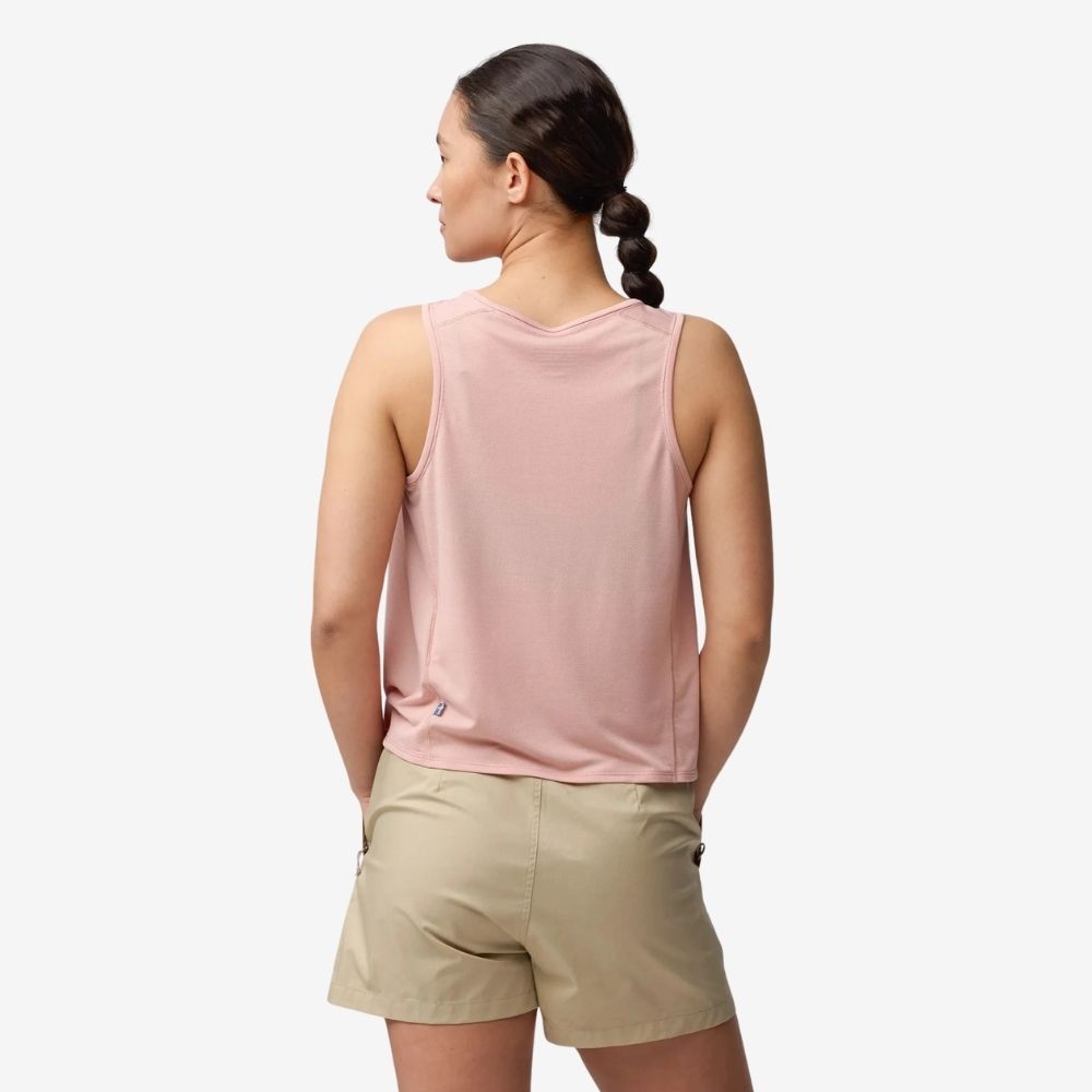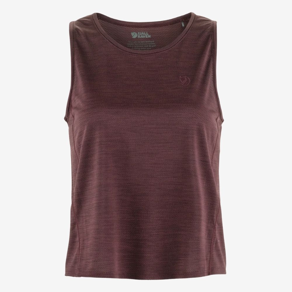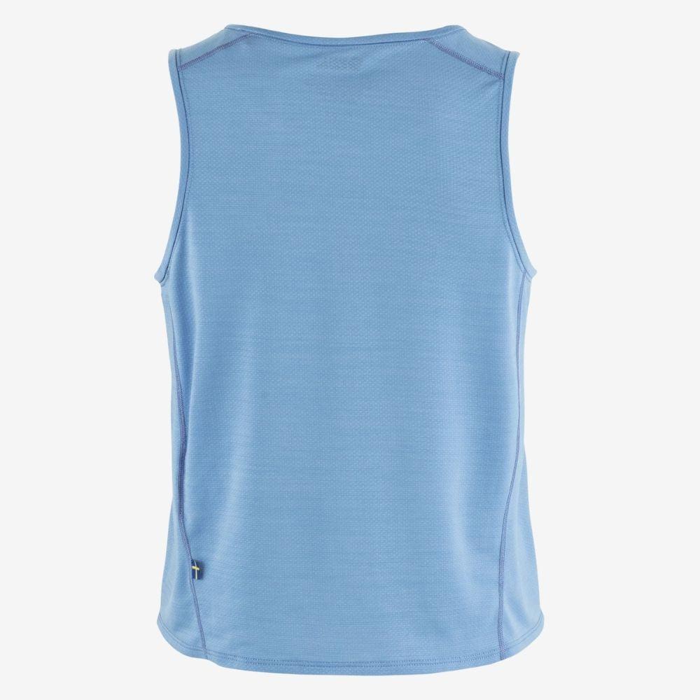 Fjällräven Women's Abisko Lite Tank is a featherlight, recycled-poly layer that wicks and dries fast, with a mesh-like feel, back-set shoulder seams to reduce pack rub, and a slightly cropped cut that pairs well with high-waist bottoms.
